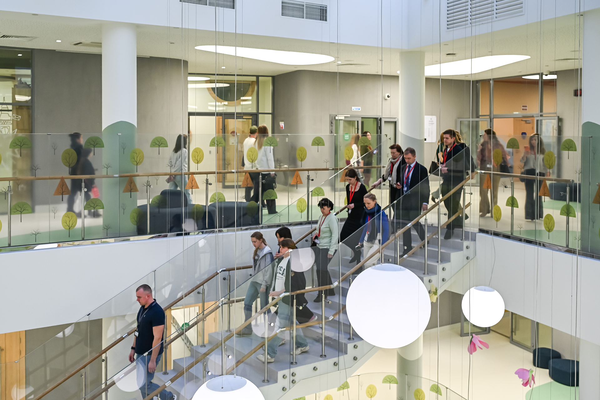 26 марта гости побывали в Хорошколе на улице Народного Ополчения, (квартал Wellton Park). Встреча началась с общения с руководством, которое затем продолжилось в формате экскурсии. Участники осмотрели здание гимназии, спроектированное и построенное концерном «КРОСТ», увидели знаменитые парящие лестницы, ознакомились с технологичными пространствами классов.