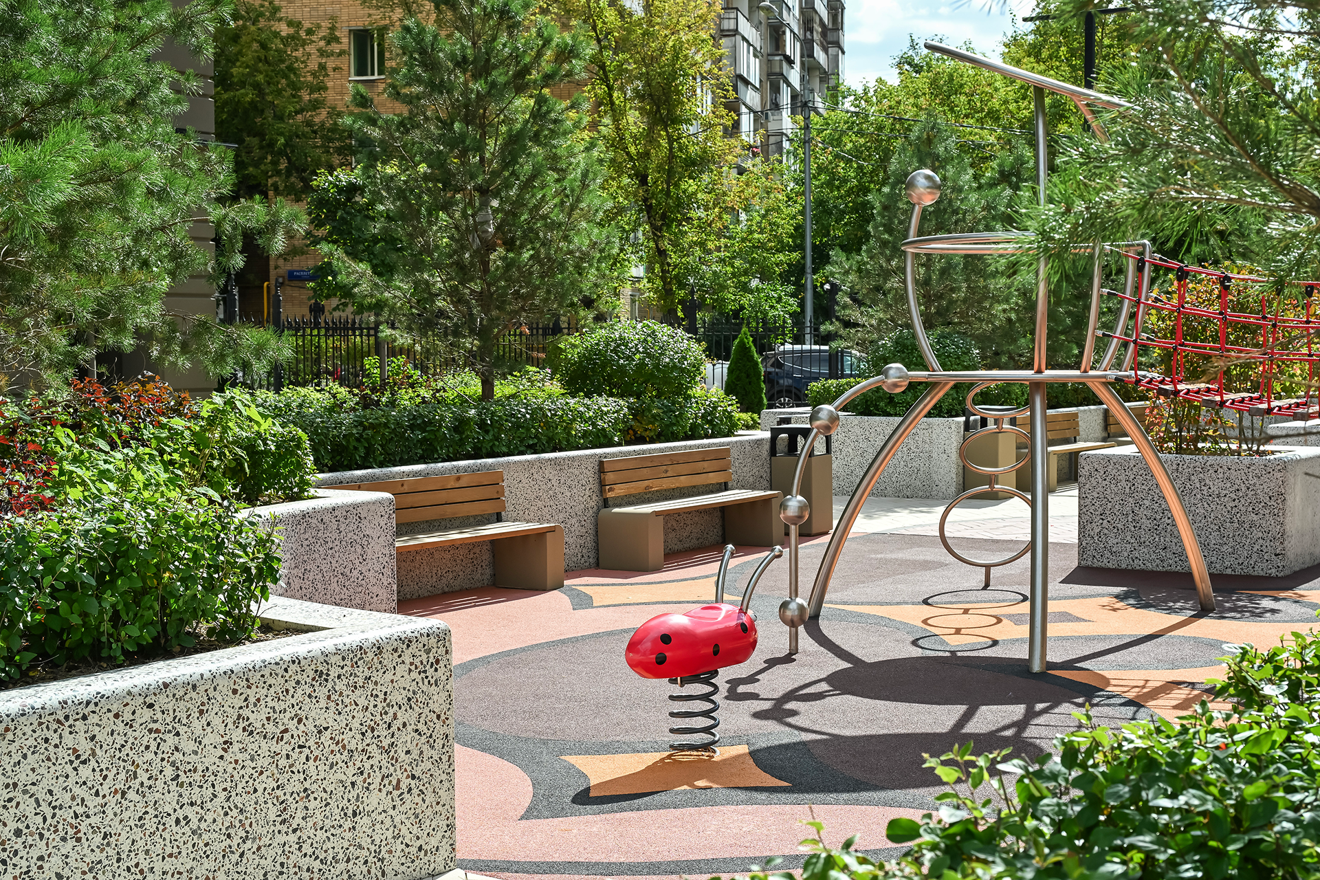 Территория благоустроена пешеходными дорожками, многофункциональными детскими площадками, местами для отдыха и арт-объектами.