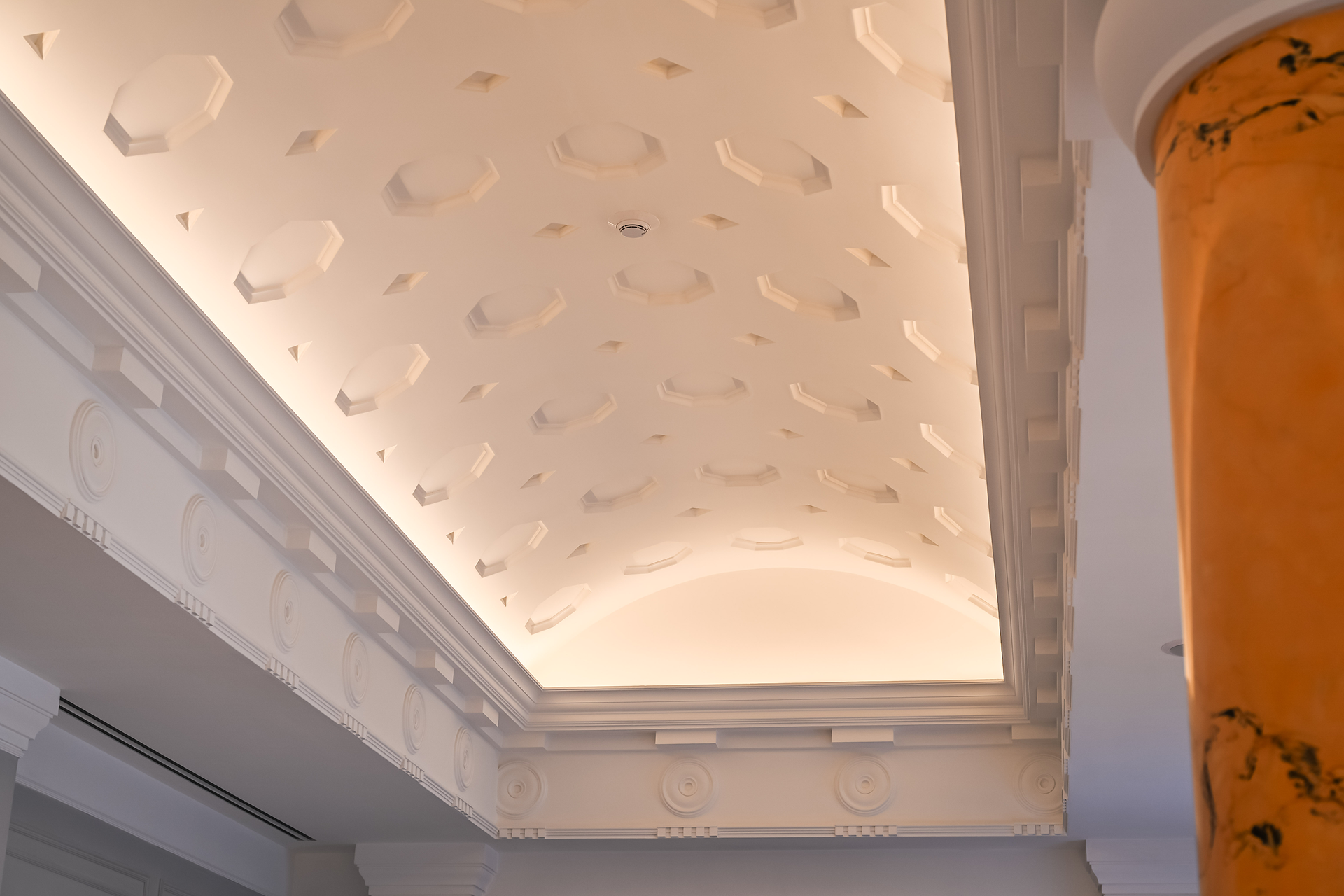 Мощные дорические колонны с охристыми прожилками напоминают о величии особняка Воронцова-Дашкова, а геометрия потолка с восьмигранными кессонами переносит нас на станцию метро «Красные ворота» — еще одно гениальное творение зодчего.