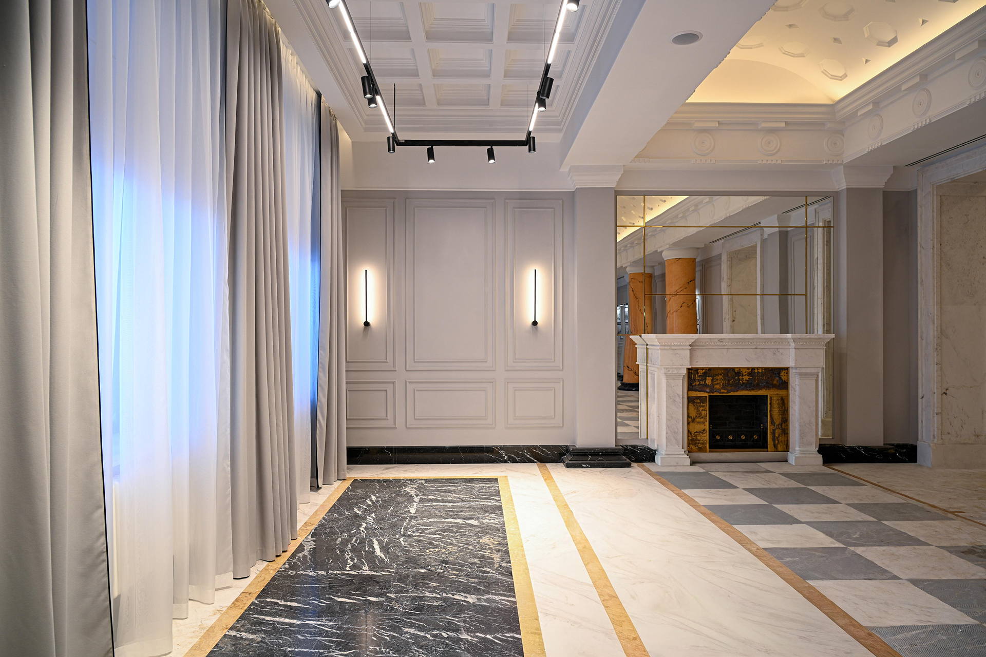 Изысканная черно-белая клетка из мрамора отсылает к проекту вестибюля особняка Абамелек-Лазарева. Центральный элемент вестибюля — роскошный камин с зеркальным панно, прямое наследие кабинета княгини Шаховской.