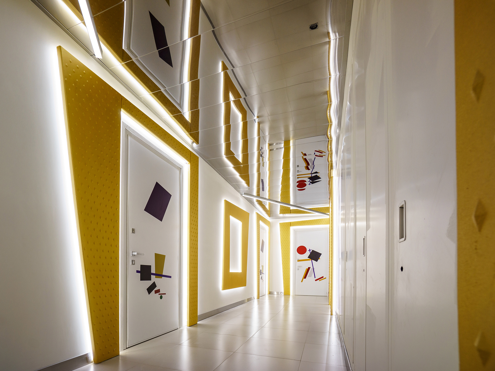 Дом «МАЛЕВИЧ» — это пространство, где искусство стало не просто декором, а философией проекта. Здесь нет случайных линий и деталей, супрематизм здесь воплощен во всем: от архитектурной концепции до дизайна входных групп и паркинга. Эстетика русского авангарда продолжается в лифтовых холлах и на этажах, в уютном внутреннем дворе и в арт-парке, напоминающем галерею супрематических образов, сошедших с картин и реализованных в трехмерном пространстве.