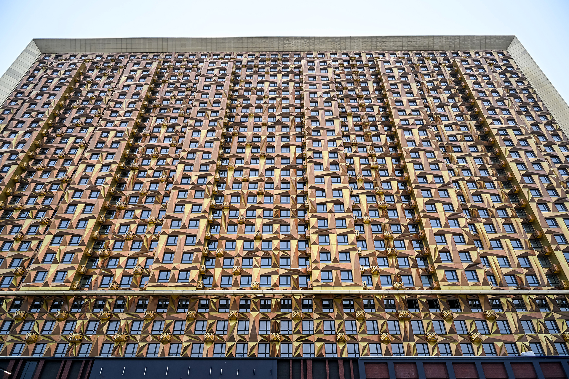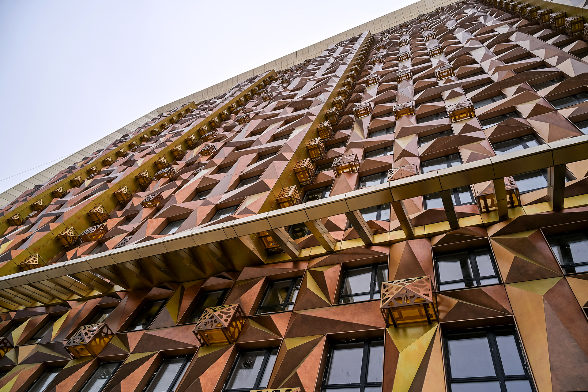 Тысячи уникальных алюминиевых кассет четырех сложных оттенков — «Шампань», «Золотой мед», «Червонное золото» и «Чеканная монета» — сложились в сияющий высокополигональный объем.